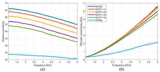 (a) Relative permittivity and (b) effective conductivity of MUTs as a function of frequency.