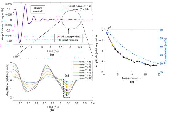 The measured raw signals of an exemplary channel are presented at Figure 5a. Obviously, the static clutter (antenna crosstalk) is much stronger than the target response, but even the small change of the dielectric properties of the target can be detected. Figure 5b shows the differential signals . The correlation between decreasing relative permittivity of the target and the difference amplitude in the period representing the target response is presented in Figure 5c. The trend of this curve corresponds to the expected behavior—the magnitude of the differential signal in this range confirms the change in acetone concentration, where the successive steps decrease with the ongoing procedure. The important and promising aspect of this result is the almost monotony of the magnitude of the differential signal. It shows the capability of the radar system and the measurement setup and exhibits that even small permittivity variations are detected.