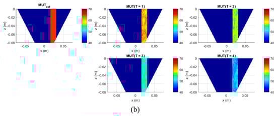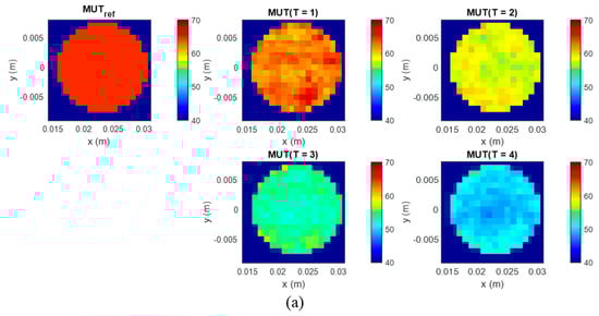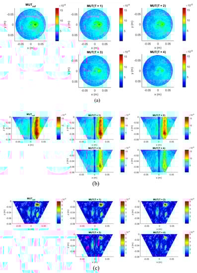 At the preprocessing stage of our second measurement scenario before imaging of the measured non-differential signals, we need to exclude the influence of the plastic tube on the results. For this purpose, we use a measurement of only background material and a measurement with background material plus a tube filled with background material. Their difference estimates the effect caused by the presence of the plastic tube in the phantom and then is subtracted from all five measurements with tumor imitate. After this, 3D images are generated from these cleaned data via the adapted DAS algorithm (Equation (6)). The imaging domain has dimensions as defined in the description of Figure 3, with a resolution step of 1 mm for all dimensions. The images of measurements with MUTref and MUT (T = 1…4) are presented in Figure 6. The minimum in the center of the phantom is caused by antennas crosstalk removal by means of rotational average value subtraction of each channel [].