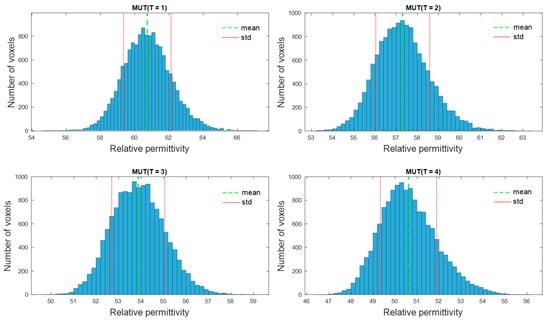 We can estimate the dielectric properties based on the images reconstructed via the adapted DAS algorithm (Figure 6). The image values represent the data at the whole frequency band of the UWB measurement setup. Relative permittivity is estimated for each of four phantom’s images by means of Equations (9) and (10), where the frequency dependent dielectric properties of the reference scenario are known. The distribution of the estimated relative permittivity exemplarily at 2 GHz in the tumor region of MUT (T = 1…4) is presented in Figure 7.