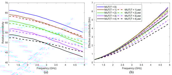 According to Equation (10), the permittivity estimation algorithm is applied from 1 to 5 GHz. The effective conductivity is calculated via Equation (1). The comparison of the mean values of the estimated dielectric properties of MUT (T = 1…4) in the 3D tumor region and measured ones (Figure 4) is shown in Figure 9.