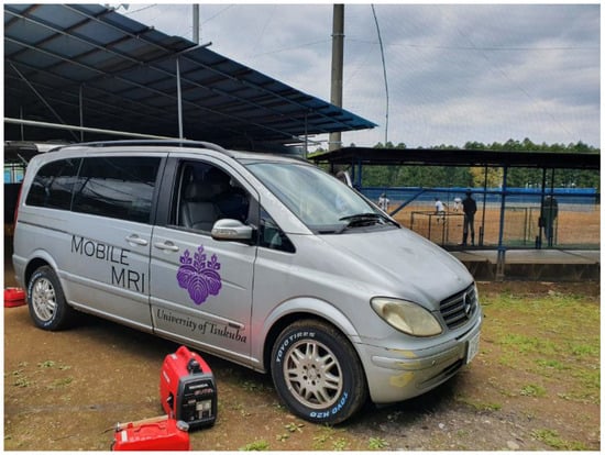 The mobile MRI system consisted of a permanent magnet, gradient coils, a radio frequency (RF) probe with shielding cloths, and the MRI console (Figure 2). Since the RF probes are consumable, we replaced the damaged coil once during the study period; 32 cases were imaged with the first-generation RF probe, and 119 cases with the second-generation RF probe. The overall weight of the system was below the maximum authorized payload, and all the devices could be mounted in the vehicle. All the electronic devices were operated at 100 V AC, and the required current was 10 A. A power cable was connected from the vehicle to a wall outlet at the nearest building. Hence, we could perform MRI anywhere. Our mobile MRI system is comprehensively described in our previous paper [].
