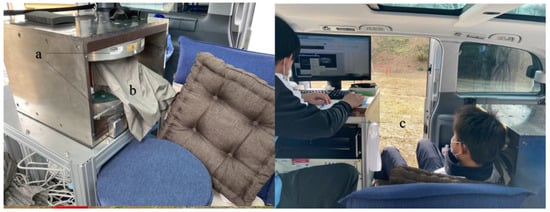 The mobile MRI system. (a) Permanent magnet. The magnet is a 0.2 T permanent magnet (NEOMAX Engineering, Japan; 200 kg; 16 cm-gap; 44 cm × 50 cm × 36 cm). The magnet was screwed onto an aluminum stand that was anchored to the sheet rail of the vehicle; (b) an RF probe was placed inside the conductive shielding cloths (ESD EMI Engineering Corporation, Tokyo, Japan). The home-built RF probe consisted of a solenoid RF coil (12 turns, 130 mm long, 94 mm in diameter) and a rectangular shield box (200 mm (x) × 200 mm (y) × 132 mm (z)) made of 200-µm-thick brass plates. The size of the RF coil was large enough to fit most of the junior baseball players; (c) MRI console: the MRI console consisted of a digital transceiver (DTRX6, MR Technology, Japan), a gradient driver (20 V, 10 A, DST Inc., Japan), a preamplifier (noise figure was 0.5 dB, gain was 30 dB; DST Inc., Asaka, Japan), an active transmit/receive switch, and a transmitter (9 MHz, 150 W; DST Inc.), which were installed on a 19-inch rack (56 cm × 77 cm × 60 cm, 80 kg). The MRI console was tightly fixed to the front seat with ropes.