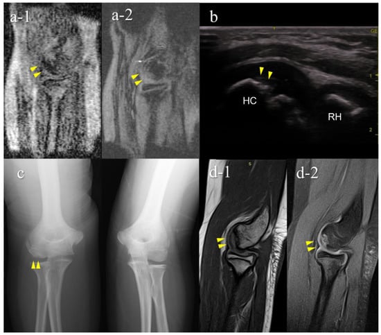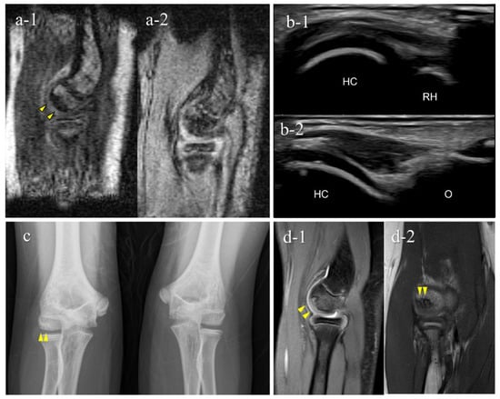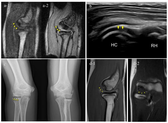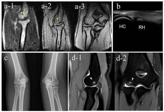 A false-negative OCD case with mobile MRI (Case 1): Mobile MRI (−), US (+). (a) Mobile MR (magnetic resonance) images: a-1, T1WI sagittal image; a-2, T2*WI sagittal image: Mobile MRI with poor imaging quality with low signal/noise ratio. Although the signal change was barely visible from the anterior to the humeral capitellum, we could not detect it; (b) US image of the posterior longitudinal view: US imaging revealed obvious subchondral bone irregularity; (c) X-p AP view with elbow 45° flexed: X-p 45° showing the lesion with fragmentation in the central capitellum, stage II OCD; (d) 3T MR images: d-1, proton density-weighted images (PDWI) sagittal image; d-2, PDWI- fat-suppressed (FS) sagittal image: 3T MRI easily detected the lesion. HC, humeral capitellum; RH, radial head; yellow arrowheads, lesions.