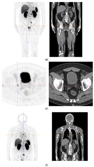 - Barbosa, F.G.; Queiroz, M.A.; Nunes, R.F.; Viana, P.C.C.; Marin, J.F.G.; Cerri, G.G.; Buchpiguel, C.A. Revisiting Prostate Cancer Recurrence with PSMA PET: Atlas of Typical and Atypical Patterns of Spread. Radiographics 2019, 39, 186–212. [Google Scholar] [CrossRef]
