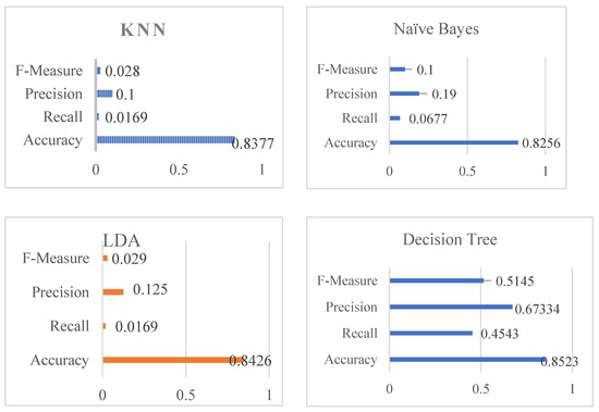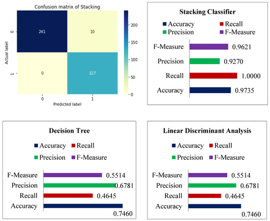 The studies were carried out using an 8 GB RAM, 2.0 GHz Intel Core i5 CPU. Windows 10 served as the operating system. For all datasets, the model was tested and trained using the Keras Python package. In order to explore the suggested stacking classifiers, KNN, NB, LDA, DT, and SVM algorithms are compared in terms of recall, precision, f-measure, and accuracy.