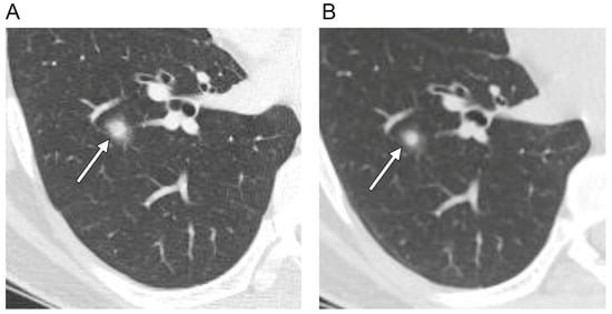 In our study, most SPCHs did not change in size, shape, or density during the follow-up period. This included a part-solid nodule with a solid portion measuring 16 mm in diameter, which did not change in size during the follow-up period of 18 months. This is another distinguishing characteristic of SPCH, considering the typical doubling time of lung cancer [26,27,28]. Interestingly, one SPCH showed a decrease in density, and two showed changes in shape or fluctuation in size during follow-up. Matsushita et al. reported an SPCH that decreased in density when CT was performed in the prone position for CT-guided needle biopsy [13]. Similar to this finding, the changes in density, size, and shape of several SPCH cases in our study may be explained by changes in the vascular pool within the capillaries, as well as by changes in the extent and stage of intralesional hemorrhage, which may be associated with SPCH histologically [4,13,24].