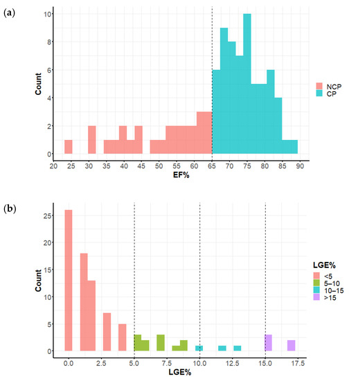 (a) EF (ejection fraction) distribution in the study group, EF = 65% was the cutpoint splitting the study subgroups into NCP (nonclassic phenotype) and CP (classic phenotype); (b) quantitative LGE (late gadolinium enhancement) distribution among the study groups. (c) Correlation of EF and LGE% (late gadolinium enhancement expressed as the percent of myocardial mass); LGE% = 5 and EF = 65% split the patient group into four quarters.