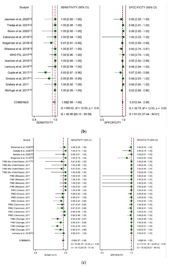 TruenatTM HCV assay: Two studies and 1181 samples in three countries evaluated the less commonly used TruenatTM HCV assay. The samples were from Spain, India, Ukraine, Georgia, and Thailand. The summary sensitivity was 95% (95% CI: 93–96%) and specificity was 99% (95% CI: 99–100%) between 2017 and 2019 (Figure 4e).