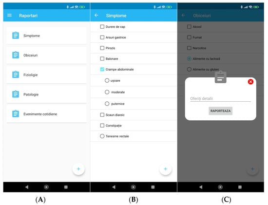 (A) Reports screen, (B) Symptoms screen, (C) Detailed report. (A) Symptoms, Customs, Physiology, Pathology, Daily events. (B) Symptoms, Headache, Heartburn, Bloating, Abdominal cramps (mild/moderate/severe), Diarrhea, Constipation, Rectal tenesmus. (C) Provide details, Report.