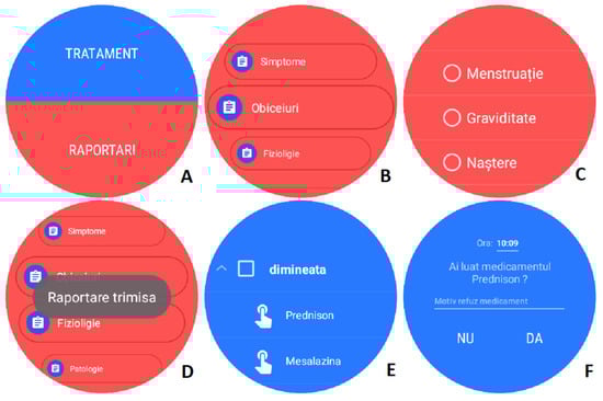 The mobile app is used for medication administration reminders, treatment and event reporting. The app is fully patient-oriented and has the sole purpose of easing the patient’s way of reporting. The mobile app was developed in Android Studio Bumblebee 2021.1.1 (https://developer.android.com/studio/releases 10 February 2022) using the Windows version. The same software was used for the smartwatch app. The IBD Monitor app is publicly available via Google Play (https://play.google.com/store/apps/details?id=ro.umf.ibmmontior 5 May 2022), though it can only be used after the patients are enrolled by their physician.
