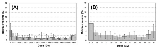 Both cDVH and dDVH were computed from a dose–volume curve calculated using CT images, a structure set, and calculated dose exported from the Eclipse TPS in-house using MATLAB (MathWorks, Natick, MA, USA). cDVH features, including cV5Gy and cV10Gy–cV60Gy (in 10-Gy increments), and MLD, were also computed. Each dDVH feature was calculated between 5 and 60 Gy with dose bins of 2–8 Gy in 2-Gy increments (resulting in four patterns).