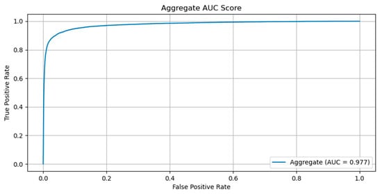 The evaluation of the configurations has been performed on the best checkpoint identified during the training process. We have obtained an AUC for the ROC curve (Figure 1) of 0.977 and an AUPR for the Precision-Recall curve of 0.843 (Figure 2). The sensitivity, specificity, F1-score and MCC curves are described in Figure 2. It is important to note that the AUC value the model obtained for the ROC curve is considered to be excellent for models used in medical testing [,,]. By setting an arbitrary value of 0.5 for the decision threshold during validation (patches over the threshold are considered positive while under the threshold they are negative) we obtained an accuracy of 0.969, a sensitivity of 0.877, a specificity of 0.974, an F1-score of 0.923, and MCC of 0.745 (Figure 3).
