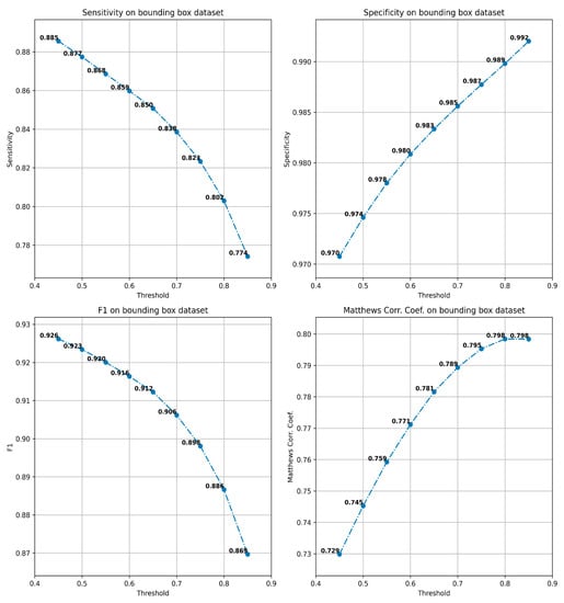 Sensitivity, specificity, F1-score, and MCC of the model computed for various thresholds.