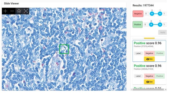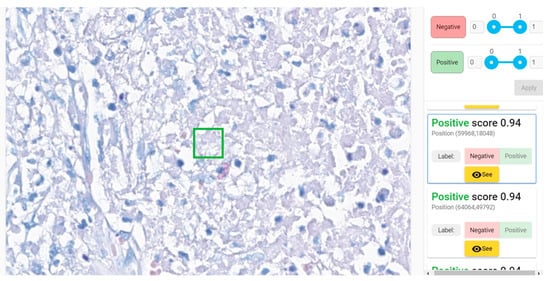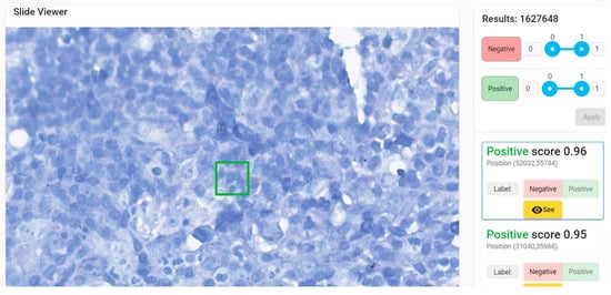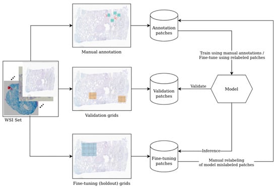 All patches with scores over 0.7—either positive or negative—were re-evaluated by pathologists. This analysis revealed that very few patches with a negative score over 0.7 (i.e., “more likely similar with negative training data set”) were a false negative. Several patches with a positive score over 0.7 (i.e., “more likely similar with positive training data set”) were erroneously labeled as such. We employed an active learning strategy for training and fine-tuning the model. To this end, we selected a fine-tuning holdout set consisting of several areas from the training WSIs that were non-overlapping with the annotations (either positive or negative). First, the model was trained from scratch with the available data. Then, inference was performed on the validation set, and the validation metrics were assessed (e.g., sensitivity, specificity, F1-score, etc.). The model then was used to classify the areas in the holdout set (which contain both positive and negative patches). The results obtained for the holdout set classification were analyzed by the pathologist team, and the mislabeled patches are correctly relabeled as negative or positive. In the end, the model was retrained for fine-tuning with these new patches. Performance was further improved by performing several iterations of this active learning cycle for the data. Given this process, as described in Figure 6, the model can be easily adapted to new conditions and variations when we obtain new WSIs.