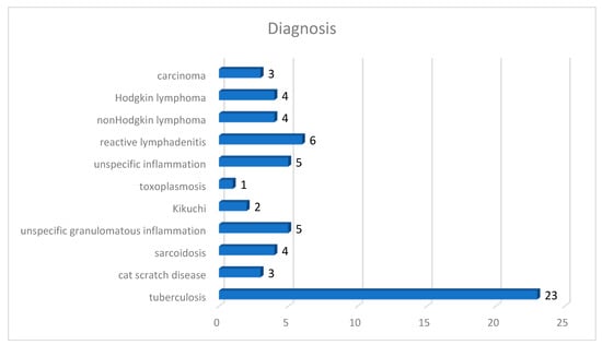 Our test group included 37 males (61.67%) and 23 females (38.33%) with a median age of 42.25 years (the youngest patient was 1 year old and the oldest was 80 years old). The specimens were represented by: lymph nodes—35 cases (58.33%), lung—10 cases (16.67%), skin—7 cases (11.67%), striated muscle—5 cases (8.33%), and intestine—3 cases (5.00%). A total of 23 cases were diagnosed as tuberculosis (38.33%) while 37 cases (61.67%) were inflammation other than tuberculosis or cancer (Figure 7): cat scratch disease 5.00%, sarcoidosis 6.67%, unspecific granulomatous inflammation 8.33%, Kikuchi 3.33%, toxoplasmosis 1.67%, unspecific inflammation 8.33%, reactive lymphadenitis 10.00%, non-Hodgkin’s lymphoma 6.67%, Hodgkin’s lymphoma 6.67%, and carcinoma 5.00%. All the cases of tuberculosis had AFB present in ZN stain; obviously, no AFB were present on ZN stain in the other cases. In order to avoid a possible bias in evaluating AFB presence due to correct identification of the lesion (i.e., diagnosing other disease than TB based on morphology alone), all the negative cases were selected to present either necrotizing granulomatous inflammation (cat scratch disease or unspecific granulomatous inflammation), granulomas (sarcoidosis), epithelioid histiocytes (toxoplasmosis), necrosis (Kikuchi, unspecific inflammation, lymphomas, or carcinomas), or florid histiocytosis (reactive lymphadenitis, or unspecific inflammation). No clinical data were available to the pathologists when examining either slides or WSIs.