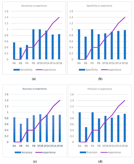 Variation of sensitivity, specificity, accuracy, and precision in correlation to pathologists’ experience. (a) Variation of sensitivity in correlation to pathologists’ experience. (b) Variation of specificity in correlation to pathologists’ experience. (c) Variation of accuracy in correlation to pathologists’ experience. (d) Variation of precision in correlation to pathologists’ experience.