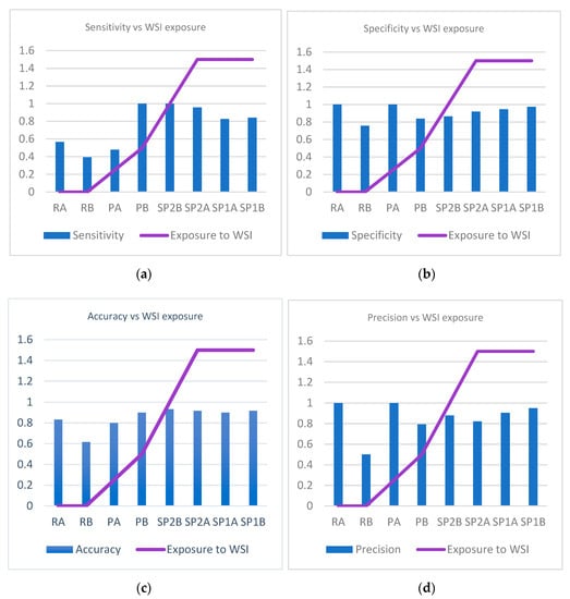When looking at sensitivity, specificity, precision, and accuracy in correlation with experience in analyzing WSI (exposure to WSI) we identify a statistically significant association for specificity (P chi test 0.004), precision (P chi test 0.008), and accuracy (P chi test 0.012), but not for sensitivity (P chi test 0.06) (Figure 9a–d).