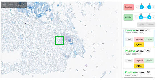Our method is an AI-assisted diagnostic method with a similar approach to Pantanowitz’s et al.’s design of the platform (analyzing a list of patches displayed in reverse order of the probability score). However, our solution employs a much larger dataset (about two orders of magnitude larger) and an active learning approach that further increases the performance metrics, especially for difficult cases (i.e., artifacts) or WSIs with peculiar staining.