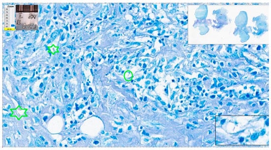 Cat scratch disease. Centrally, one structure reminiscent of AFB but pale blue in color (green oval); however, the color of red blood cells is not appropriate (green stars). Paler than regular in a good Ziehl–Neelsen stain. ZN × 400 as offered by Aperio ImageScope platform; WSI scanned with Aperio GT450, 40× magnification.