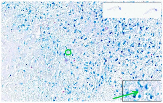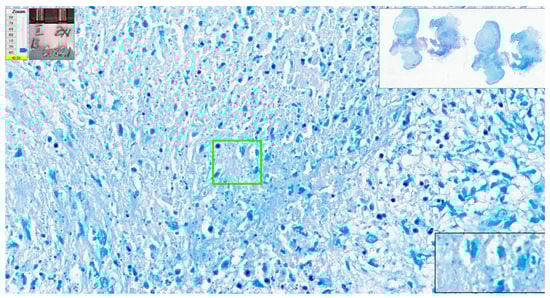 Patch of 64 × 64 pixels (in green) with a positive score of 0.96 due to the presence in the inferior right margin of the green square of several purple mast cell granules with linear arrangement mimicking an acid-fast bacillus. Hodgkin’s lymphoma, nodular sclerosis variant. ZN × 400.