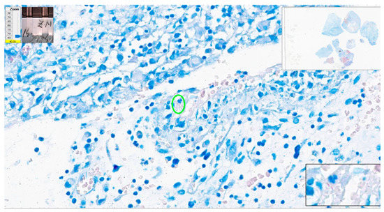 Patch of 64 × 64 pixels (in green) with a positive score (probability of similarity with positive dataset used for training) of 0.96 due to the presence in the upper left margin of the green square of a red blood cell. Lymph node with toxoplasmosis ZN × 400.