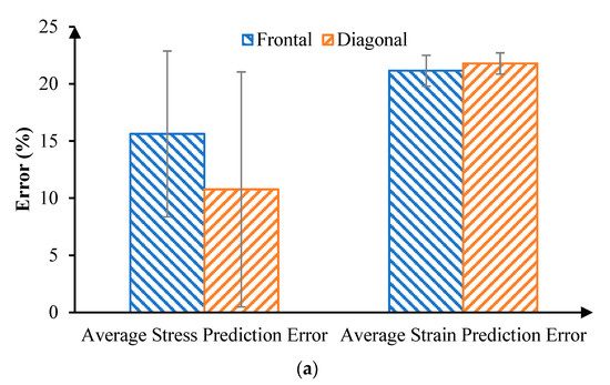 (a) Comparison of average stress and strain error between FE results and PLSR prediction results. (b) Comparison of maximum stress and strain predicted error.
