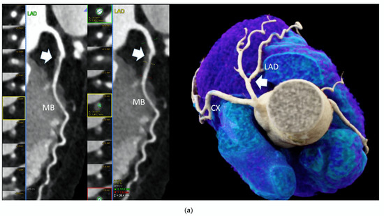 High-risk plaque (HRP) in a patient with CACS 0, a 70 years-old-male patient with ST-depression on ECG-treadmill stress test in V3-6. CT showed 37% diameters stenosis and a high-risk plaque (LAP 44 HU, positive remodeling) (white arrow) in the proximal left anterior descending artery (LAD), which were not detected by CACS (b). Diagnosis of non-obstructive CAD by CTA. Distal segment with deep myocardial bridging (MB), explaining stress test findings. (a) CTA (left: cMPR and right: 3-DVRT, spider view). LAD = left anterior descending. CX = circumflex artery.