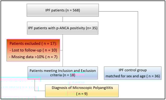 We included IPF patients with positivity for p-ANCA/MPO-ANCA at the first assessment or during the follow-up as a study group. As a control group, for each IPF p-ANCA+ patient enrolled, we included 2 consecutive individuals affected by IPF without p-ANCA/MPO antibodies from our clinical database, matched for age and sex and with at least one year of follow-up. The patients’ selection is reported in Figure 1.