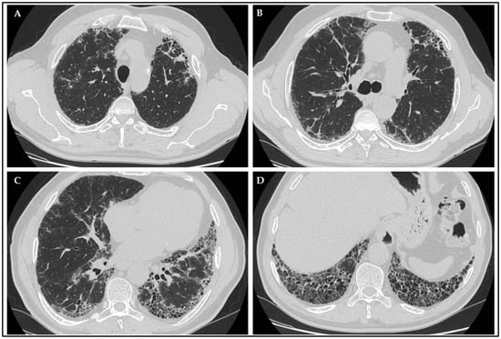 Patients performed chest HRCT, defined as computed tomography (CT) following specific protocol and slice thickness ranging between 0.625 mm and 1.25 mm, scheduled at least annually or when considered clinically necessary. Images were evaluated by a radiologist with expertise in ILD pattern definition. An example of a typical radiological UIP pattern found in the study cohort is shown in Figure 2.