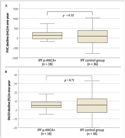 IPF patients with and without p-ANCA showed similar PFTs at the baseline and during follow-up. Complete values are reported in Table 2. The decline of FVC and DLCO is reported in Figure 3A,B.
