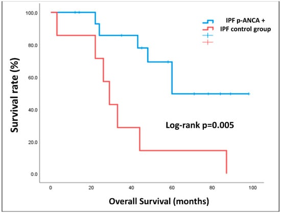 Kaplan–Meier curves of IPF positive for p-ANCA and control group.