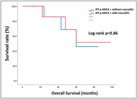 Kaplan–Meier curves of IPF positive for p-ANCA with and without occurrence of vasculitis.