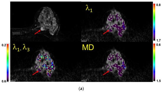 Diffusion-weighted imaging (DWI) has been shown to reduce the number of unnecessary biopsies indicated by DCE-MRI [10]. Much of the current literature on DWI uses quantitative analysis to characterize lesions, and a threshold value of 1.5 × 10−3 mm2/s for the apparent diffusion coefficient (ADC) is widely accepted as a value below which a lesion is considered to be suspicious for malignancy [10,13,14,15]. A variant of DWI is diffusion tensor imaging (DTI), which can characterize the directional changes in diffusion coefficients [16]. DTI affords multiple quantitative parameters, including the highest principal diffusion coefficient (λ1), maximal anisotropy (λ1–λ3), and mean diffusivity, also termed the apparent diffusion coefficient (MD/ADC), all of which have the potential to better characterize breast lesions [17,18]. Of note, given that the λ1 is higher in magnitude than the ADC, the threshold value for this parameter is slightly higher, 1.7 × 10−3 mm2/s. Additionally, DTI data can be displayed in the form of color-coded parametric maps that can help highlight breast lesions [17,19,20,21]. To date, studies have suggested that DTI may become a successful strategy for improving the specificity of breast MRI [22,23,24].