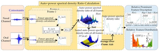 The proposed automatic VPI/non-VPI speech classification method for consonants is shown in Figure 2. The power spectral density of the acoustic signals radiated from the nasal cavity and oral cavity is approximated by that of the acoustic signals collected by the equipment. Relative prominent frequency description () features and relative frequency distribution () features between the acoustic signals of nasal and oral channels are obtained. They are extracted to model the relative sounds produced by airflow leakage to the nasal cavity. SVM classifier is used to discriminate unvoiced consonant production with and without symptoms caused by VPI.