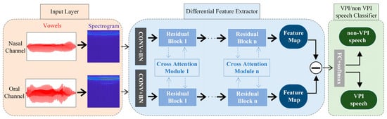 As shown, CARS-Net contains three parts: the input layer, difference feature extractor (DFE), and VPI/non-VPI speech classifier. First, the acoustic signals of vowels are collected by two microphones in front of the oral cavity and nasal cavity. They are transformed into spectrograms as the network inputs. Then, the inputs go through the DFE to produce the difference feature map. The DFE contains two branching networks for the two inputs. The two branching networks are linked by the cross-attention module proposed in this paper. Finally, the difference feature map is fed into the VPI/non-VPI speech classifier for automatic classification. The next four sections describe the details of the three parts and loss function for training the network.