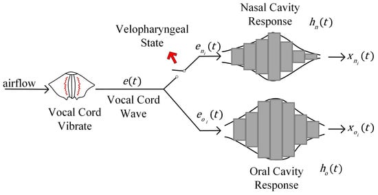 A schematic diagram of the vowel production process is shown in Figure 4. represents the vocal cord wave signal generated at the vocal cords. The airflow carrying the vocal cord waves diverges at the pharyngeal wall, partly to the oral cavity and partly to the nasal cavity, denoted as and , respectively. and represent the system response generated by nasal and oral cavity, respectively.