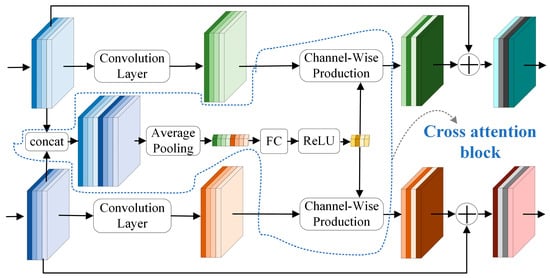 The input feature maps of the i-th residual block in each of the two backbone networks are denoted as respectively. The two input feature maps are concatenated in the channel dimension to obtain the fused feature maps, . Average pooling is performed on in the channel dimension. Pooling operations are used to refine the global information and reduce the number of operations [].