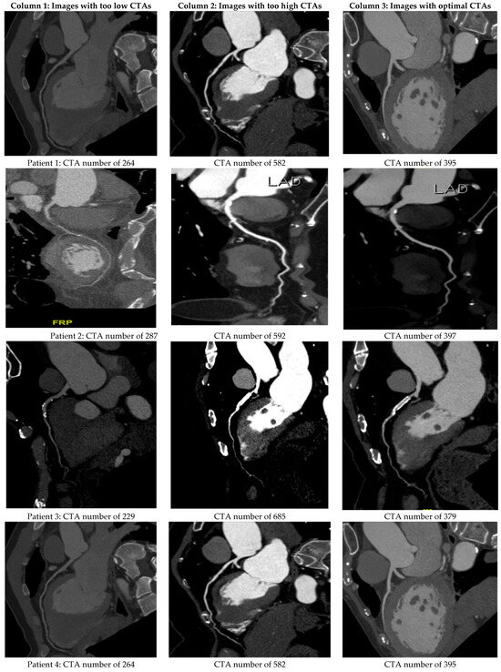 Figure 5 shows the CT images obtained with optimal, too-low, and too-high CTA numbers of LA for six of the sixty-five patients in the testified group. The optimal imaging quality provided a suitable diagnosis and reduced any misreading or misinterpretation of imaging in clinical treatment.