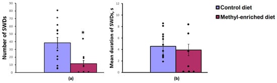 Number (a) and mean duration (b) of SWDs in adult offspring of WAG/Rij rats born to mothers fed a methyl-enriched (n = 8) or control diet (n = 13). Data are the mean ± S.E.M. The individual data points are displayed in bar graphs to show within-group variability. *—p < 0.05 compared with the corresponding values in the control group.