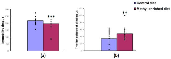 Immobility time (a) and duration of the first episode of active swimming or climbing (b) in the forced swimming test in adult offspring of WAG/Rij rats born to mothers fed a methyl-enriched (n = 8) or control diet (n = 13). Data are the mean ± S.E.M. The individual data points are displayed in bar graphs to show within-group variability. ***—p < 0.001, **—p < 0.01 compared with the corresponding values in the control group.
