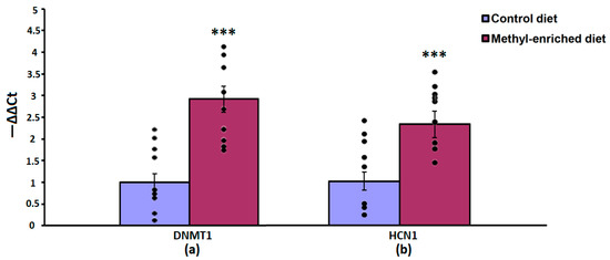 The mRNA expression levels of DNMT1 (a) and HCN1 (b) genes in the somatosensory cortex in adult offspring of WAG/Rij rats born to mothers fed a methyl-enriched or control diet. Expression of the DNMT1 and HCN1 mRNA were determined by real-time qPCR in 9 pairs of tissue samples from the control (n = 10 rats) and experimental (n = 10 rats) group of animals. Data are the mean ± S.E.M. The individual data points are displayed in bar graphs to show within-group variability. ***—p < 0.001 compared with the corresponding values in the control group.