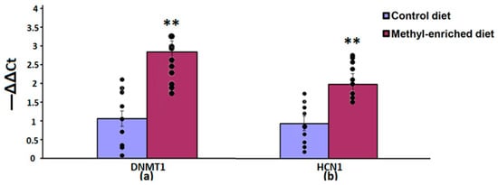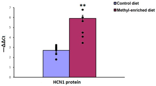 In the hippocampus, a maternal methyl-enriched diet increased the mRNA expression levels of DNMT1 [H(1,18) = 12.8, p < 0.01] and HCN1 [H(1,18) = 12.8, p < 0.01] genes (Figure 5).