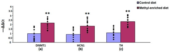 The mRNA expression levels of DNMT1 (a), HCN1 (b), and TH (c) genes in the nucleus accumbens in adult offspring of WAG/Rij rats born to mothers fed a methyl-enriched or control diet. Expression of the DNMT1, HCN1, and TH genes was determined by real-time qPCR in 9 pairs of tissue samples from the control (n = 10 rats) and experimental (n = 10 rats) group of animals. Data are the mean ± S.E.M. The individual data points are displayed in bar graphs to show within-group variability. **—p < 0.01 compared with the corresponding values in the control group.