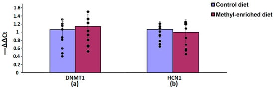 In the hypothalamus, a maternal methyl-enriched diet had no statistically significant effect on the mRNA expression levels of DNMT1 [F(1,16) = 0.55, p = 0.46] and HCN1 [F(1,16) = 0.76, p = 0.4] genes (Figure 7).