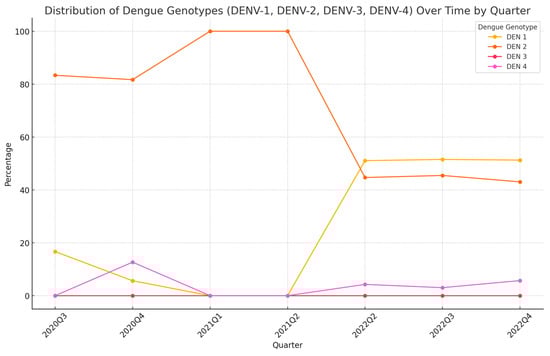 Distribution of dengue serotypes (DENV-1, DENV-2, DENV-3, DENV-4) over time. This figure shows the percentage distribution of Dengue virus genotypes DENV-1, DENV-2, DENV-3, and DENV-4 in Quang Nam province, Vietnam, from 2020 to 2022 in each annual quarter. The x-axis represents the quarters of each year (Q1 = January–March; Q2 = April–June; Q3 = July–September; Q4 = October–December), while the y-axis indicates the percentage of each Dengue serotype. The data points are connected by lines to illustrate the trends over time. Notably, DENV-2 was predominant in 2020–2021, whereas DENV-1 became the most prevalent in 2022. DENV-3 was not detected in any of the samples throughout the study period. The fluctuations in genotype distributions underscore the dynamic nature of Dengue epidemiology in the region.
