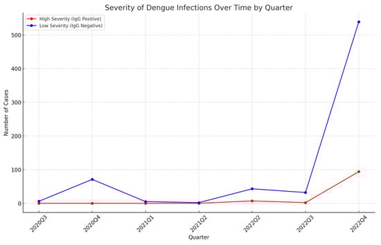 Despite low-severity cases being more common, there is a noticeable increasing trend in high-severity cases (IgG-positive) over time, as shown in Figure 2. This trend is alarming and suggests that the severity of Dengue infections is escalating in the region. The increase in high-severity cases may be attributed to multiple factors, including changes in the circulating genotypes, environmental factors, and the population’s immune profile. This is critical because secondary infections are associated with more severe clinical outcomes, including Dengue hemorrhagic fever (DHF) and Dengue shock syndrome (DSS), due to the antibody-dependent enhancement (ADE) effect. The ADE effect occurs when heterotypic antibodies bind but fail to neutralize virions of the subsequent infecting DENV type, potentially enhancing viral entry into host cells and exacerbating the immune response [,].