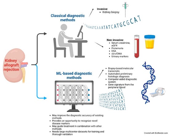 Changes in gene expression in kidney transplant rejection have been studied in detail as part of the Molecular Microscope Diagnostic System (MMDx) project using ML-based algorithms and aiming to define the molecular basis of rejection []. MMDx is currently available as a commercial test. Molecular testing is performed on an additional biopsy core that is stabilized in RNAlater to prevent damage to the ribonucleic acid (RNA). In a first step, microarrays are used to evaluate the expression of messenger RNA (mRNA) in the biopsy. Currently, the expression of 19,462 unique genes is being measured []. Next, these measurements are interpreted using ML-derived algorithms. The biopsy sample is compared to a reference set of previously characterized biopsies. Rejection states and parenchymal injury as well as the probability of kidney transplant survival are then assessed. Since genes change their expression in a coordinated pattern, pathogenesis-based transcript sets associated with different types of rejection or injury have been created, based on the theory that one molecule plays multiple roles in various biological processes. The MMDx project, with its crude beginnings, has a history of nearly two decades and is constantly expanding its reference set and improving its ML-derived diagnostic algorithms [].