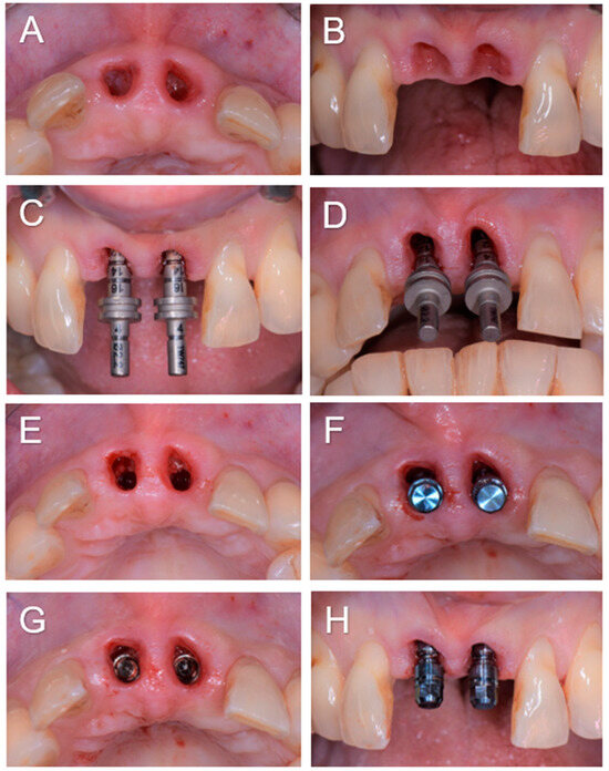 (A–N). Intraoperative view showing sockets after curettage (A,B) and the control of the drilling axes of sites 11 and 21 (C,D), and an occlusal view showing implant bed preparation (E). The occlusal (F,G) and buccal (H) view after the placement of implants (Bone Level, Ø3.4 × 10 mm, Straumann, Switzerland) at sites 11 and 21, showing small buccal bone defect ‘’dehiscence-like’’ at sites 11 and 21. The buccal view with transfer device screwed onto the implants for impression taking (I). The clinical view showing the augmented sites using autogenous bone chips and alloplastic bone (BoneCeramic™, Straumann, Switzerland), after the impression (J) and 3 h later (K) during the fixation of the screw-retained temporary crowns (L,M) and the periapical 2D radiographs taken immediately after implant placement (N).