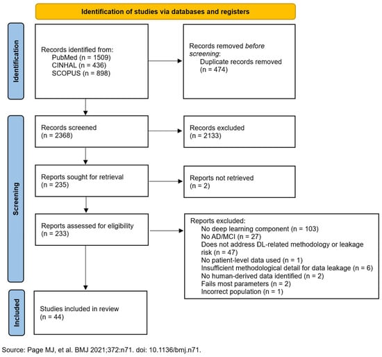 A scoping review was chosen as the most appropriate methodology for examining the landscape of data leakage in AD deep-learning research, as our primary objective was to map the extent, range, and nature of methodological practices rather than to synthesize effectiveness data or provide clinical recommendations. Unlike systematic reviews that synthesize effectiveness data, scoping reviews map research landscapes and identify knowledge gaps without restrictive inclusion criteria. This review does not determine which deep-learning approach is “best” for AD diagnosis or provide pooled accuracy estimates—the methodological heterogeneity documented would make such a synthesis meaningless. Instead, it identifies why reported performance varies so dramatically and what methodological standards are needed before meaningful comparisons can be made [].